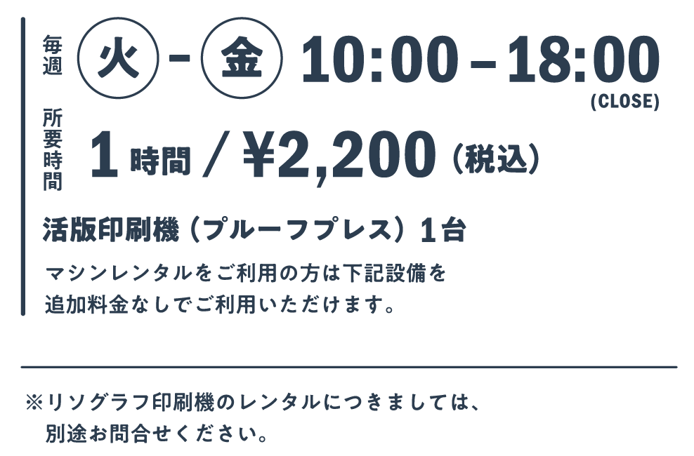 Tomigaya Studio offers rental of a proofing machine, a printing machine used for letterpress printing. From small business cards and shop cards to large poster sizes, it can be used for personal production.